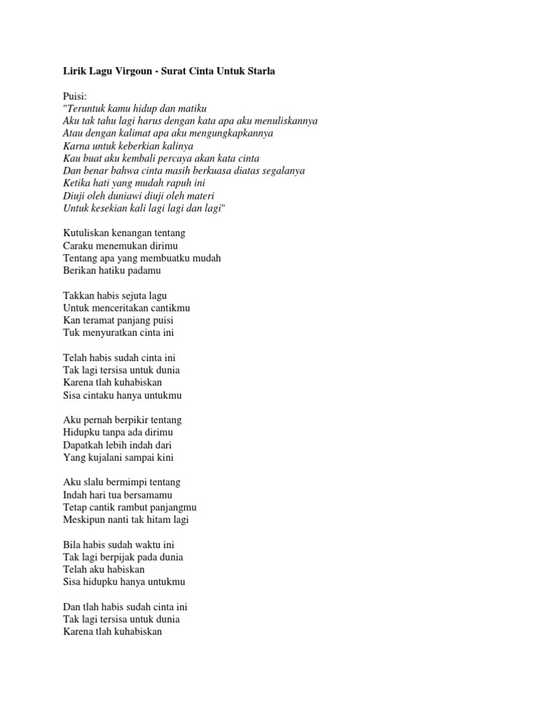 Lirik surat cinta untuk starla oleh virgoun. Dibawah akan kita sediakan kunci gitar surat cinta untuk starla dari virgoun yang bisa kamu mainkan, dan semoga bisa membantu kalian yang lagi cari chord di atas semoga bisa membantu anda dalam memainkan gitar, lagu cinta di atas bisa dijadikan lagu untuk pemula saat belajar gitar. Virgoun surat cinta untuk starla lirik mp3 duration 3:57 size 9.04 mb / 26lirik 7. Lagu surat cinta untuk starla yang diciptakan virgoun pada awal tahun 2016 sebenarnya ditujukan untuk anaknya yang bernama starla sebagai ungkapan rasa kasih sayang kepadanya. D g untuk menceritakan cantikmu em am kan teramat panjang puisi.