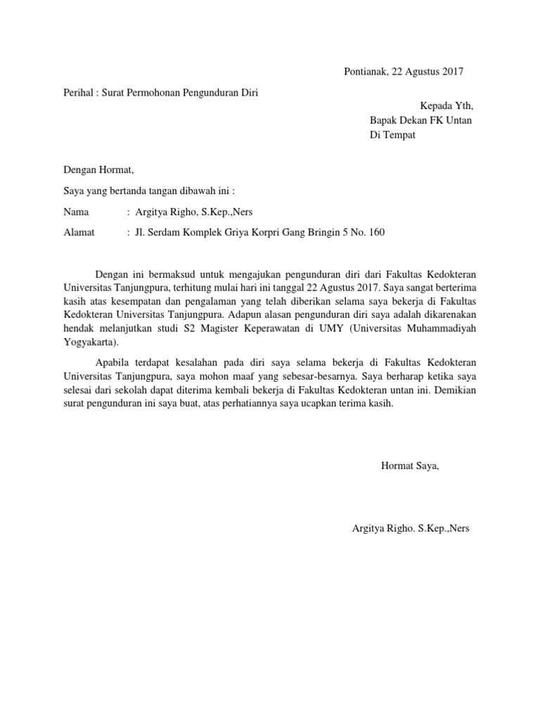 Contoh surat pengunduran diri dari kuliah walaupun hampir sama dengan surat pengunduran diri dari sekolah tetapi jauh lebih rumit formatnya. Ilmu contoh surat pengunduran diri sebelumnya, kita lihat komposisi surat itu sendiri. Download contoh pengunduran diri berbagai keperluan dalam bentuk dokumennya dan pdf ( disini ). Bagi yang membutuhkan contoh surat pengunduran diri dari kuliah, kami telah menyediakannya dalam bentuk file dokumen word dan pdf yang dapat anda rubah ataupun mengeditnya. Contoh surat pengunduran diri kerja yang benar serta baik, pengajuan pemberhentian kontrak kerja secara sepihak yang dilakukan oleh pekerja lajimnya disebut dengan resign dimana dalam pengunduran kerja ini tentu saja banyak hal yang menjadi penyebab dan alasan kuat kenapa anda. Nah, berikut ini kami sajikan beberapa contoh penulisan surat pengunduran diri dengan baik dan benar untuk berbagai tempat kerja atau organisasi. Contoh surat pengunduran diri yang baik ii kepada yth. Dan harapannya, ia bisa tetap bekerja sampai jangka waktu yang lama bahkan hingga pensiun. Contoh surat pengunduran diri itu seperti dibawah ini: Contoh surat pengunduran diriapril 4, 2010 | in: Misalnya lingkungan serta budaya kerja yang tak sesuai dengan karakter kamu, besaran gaji yang tak sesuai dengan kerjaan yang diberikan oleh perusahaan. Silahkan saja menuju lokasi link yang telah kami sediakan di dalam artikel ini. Hormat saya harli contoh surat pengunduran diri diatas tampak lebih kompleks dan lengkap dari sebelumnya.